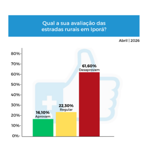 Entre os entrevistados que opinaram na pesquisa, 61,6% classificaram as estradas rurais de Iporá como ruins ou péssimas. A pergunta foi direta: qual avaliação você faz das estradas rurais do município?