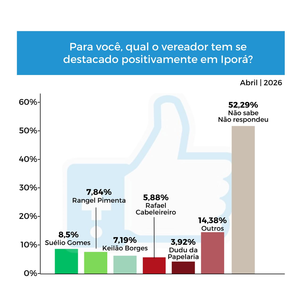Mais da metade dos entrevistados, 52,29%, não soube ou preferiu não responder quando questionada sobre qual vereador tem se destacado positivamente em Iporá.