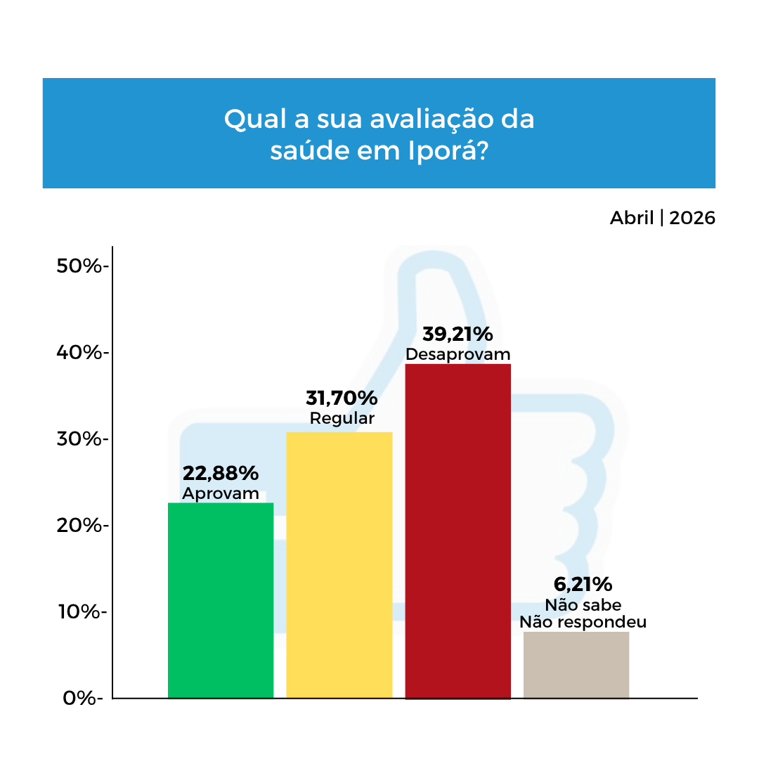 A avaliação da saúde municipal em Iporá registra 39,21% nas categorias ruim ou péssima. Apenas 22,88% classificam como boa, sem registro de avaliação ótima. A opção regular aparece com 31,7%, enquanto 6,21% não souberam ou não responderam.
